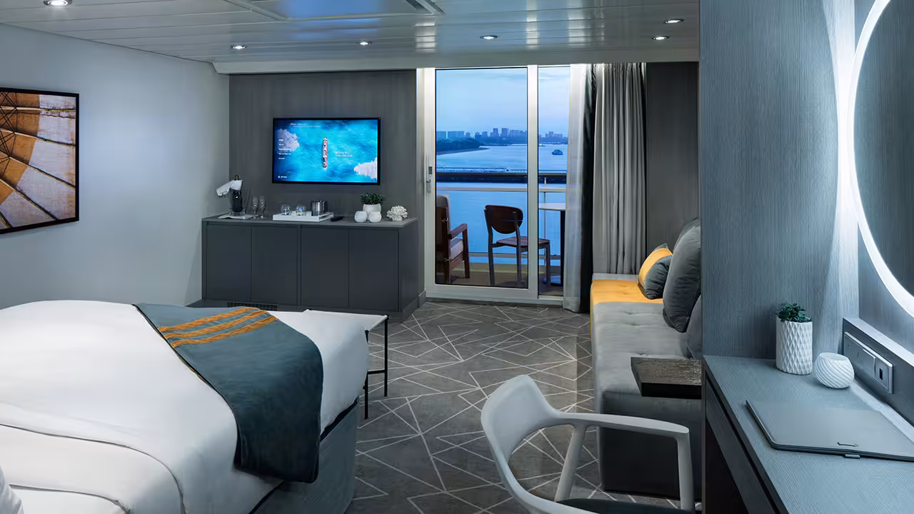 Celebrity Summit AquaClass guests enjoy a spacious private veranda, eXhale bedding, premium bathroom amenities, including a massaging showerhead and complimentary fitness classes.